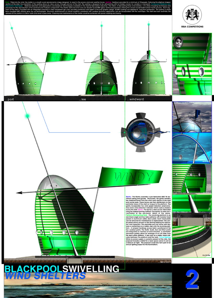 The project was published extensively and received the following award : 2002 Royal Institute of British Architects Blackpool Swiveling Wind Shelters International Competition 2nd Prize