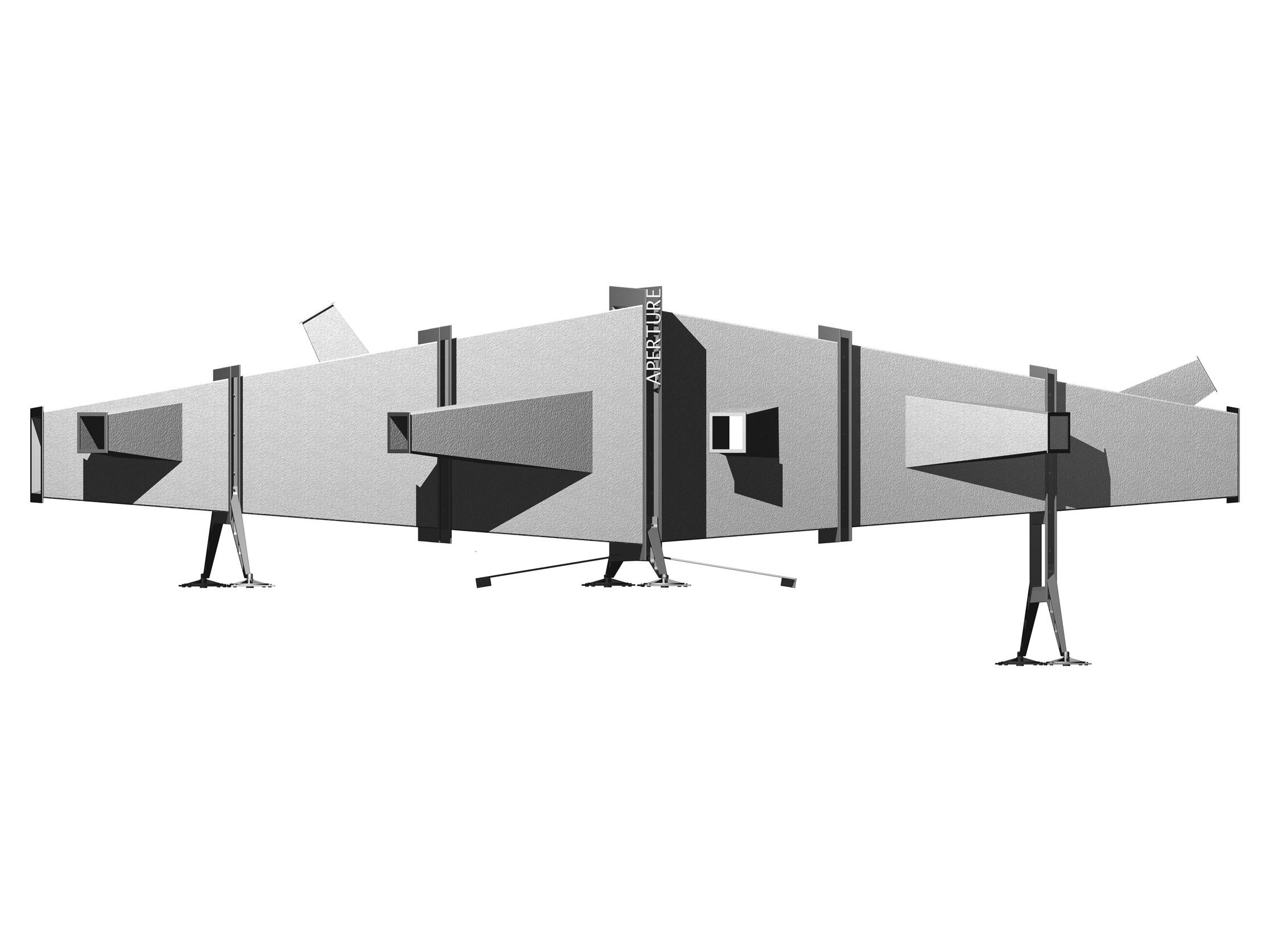 APERTURE is assembled on site from six modular sections, each section is fabricated off-site and transported, by air lift, to the site location. Modules are connected by stiffening collar frames. Pre-cast concrete footings anchor the sand-cast aluminum outrigger legs and stabilizer plates.